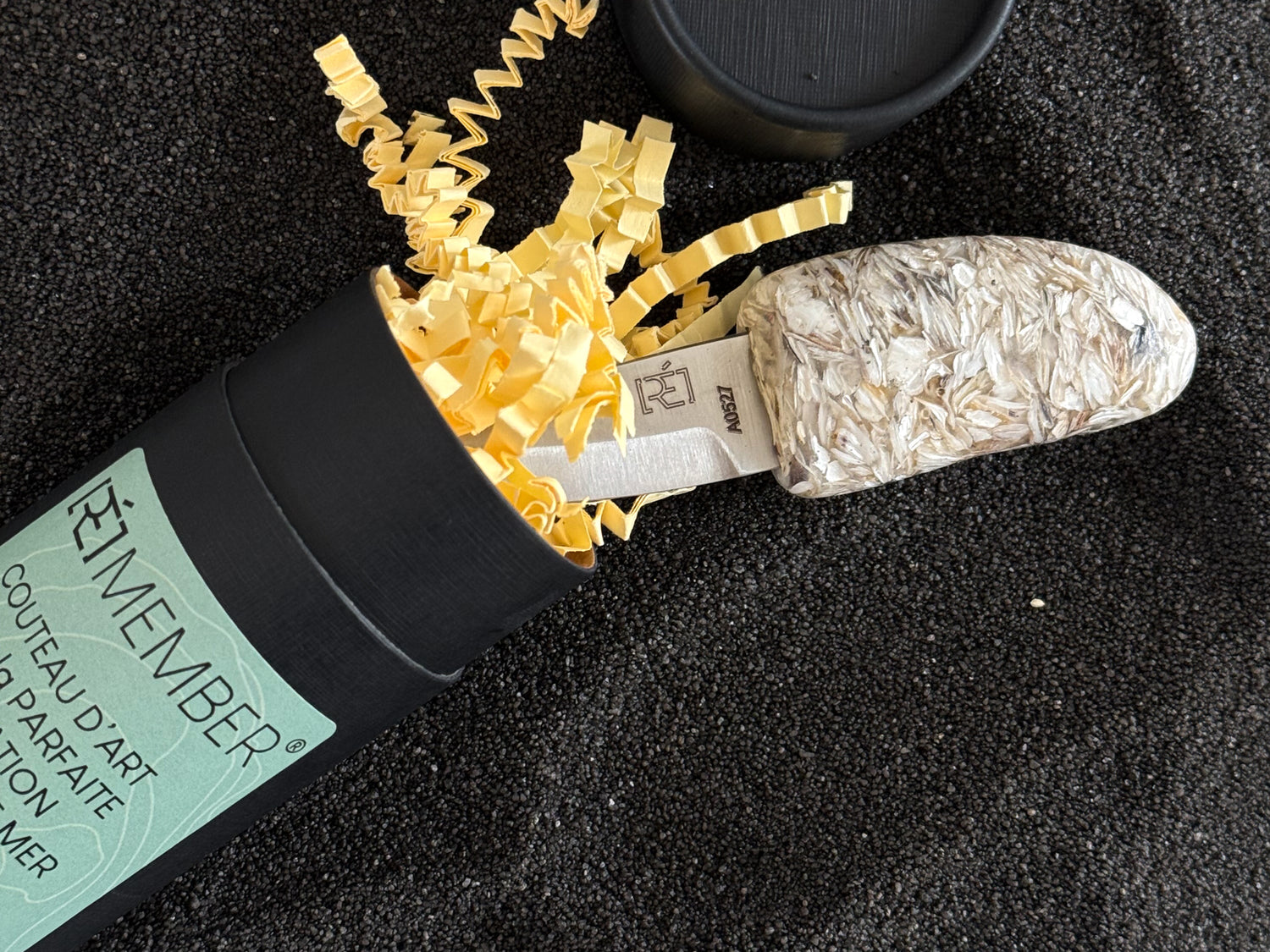 Livré dans un tube en carton recyclé, chaque couteau à huitre [Ré]member est unique et livré avec son certificat d’authenticité mentionnant le numéro de série de la lame en acier.